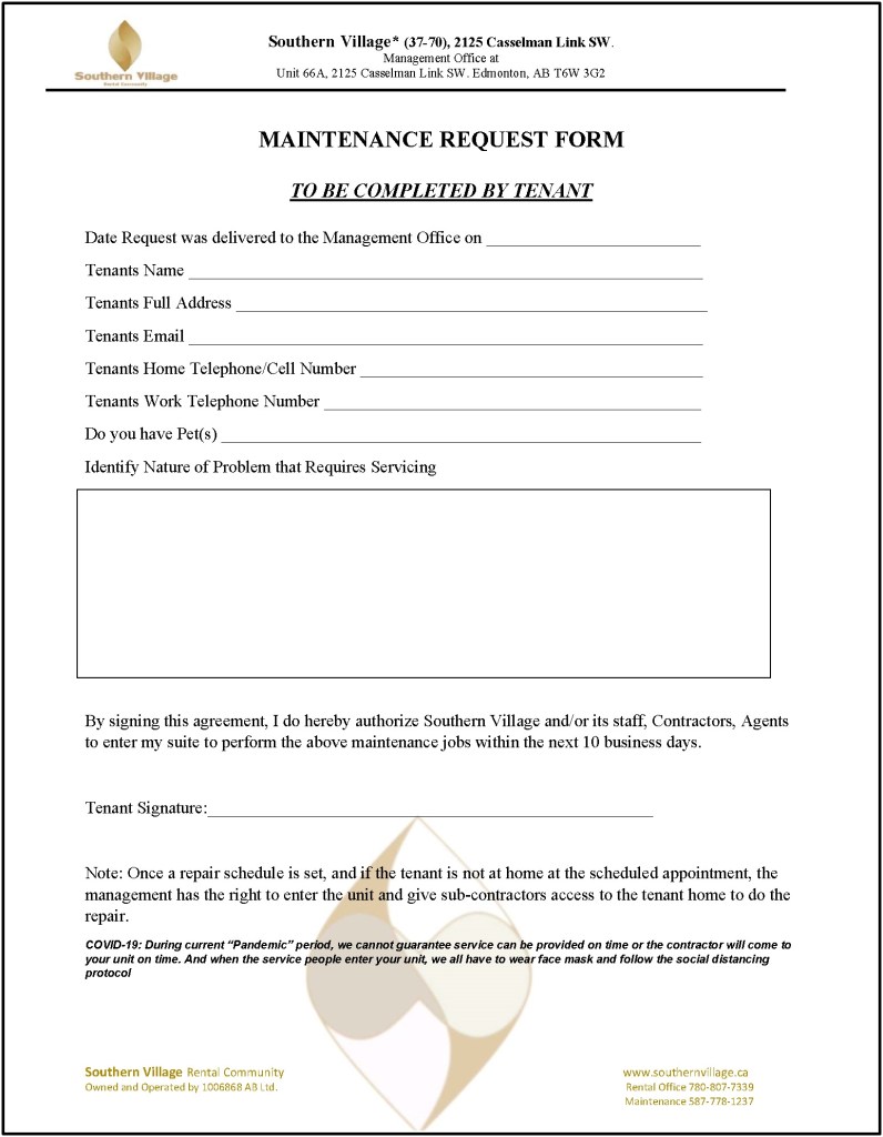 By requesting the maintenance you hereby give permission for the site staff or contractors to enter your suite.